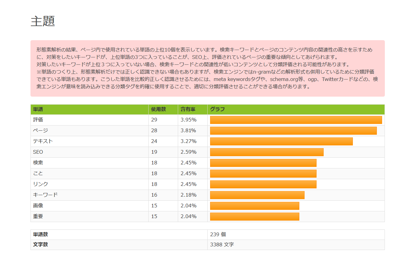 「高評価」の最大の特徴は、各ページ単位でのSEO対策度合いを評価できることです。ブログ記事やウェブページごとに、指定したキーワードに対するSEOの最適化状況を分析し、具体的なスコアを出してくれるんです。これにより、どのページが検索エンジンにとって魅力的かが一目でわかります。