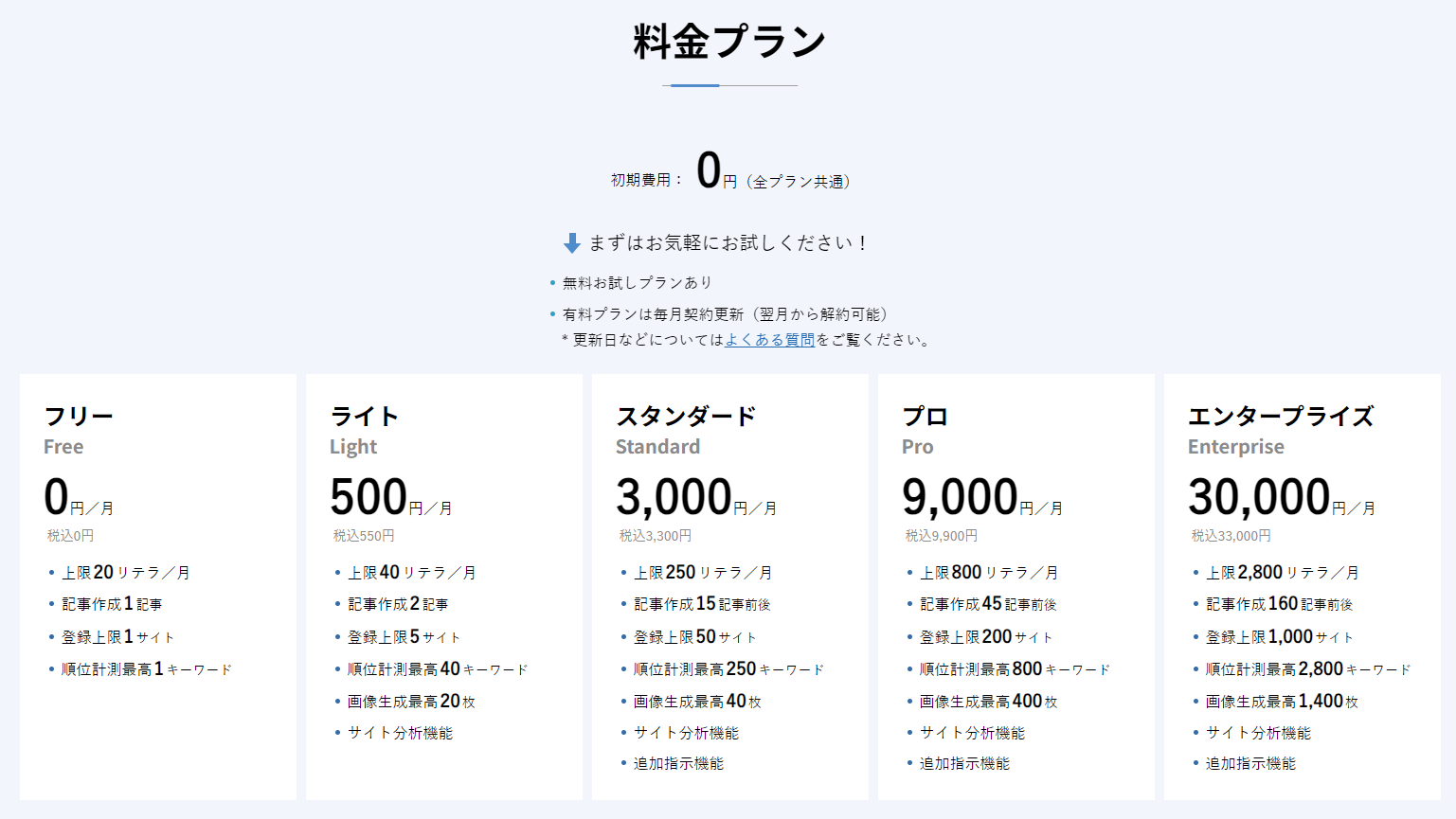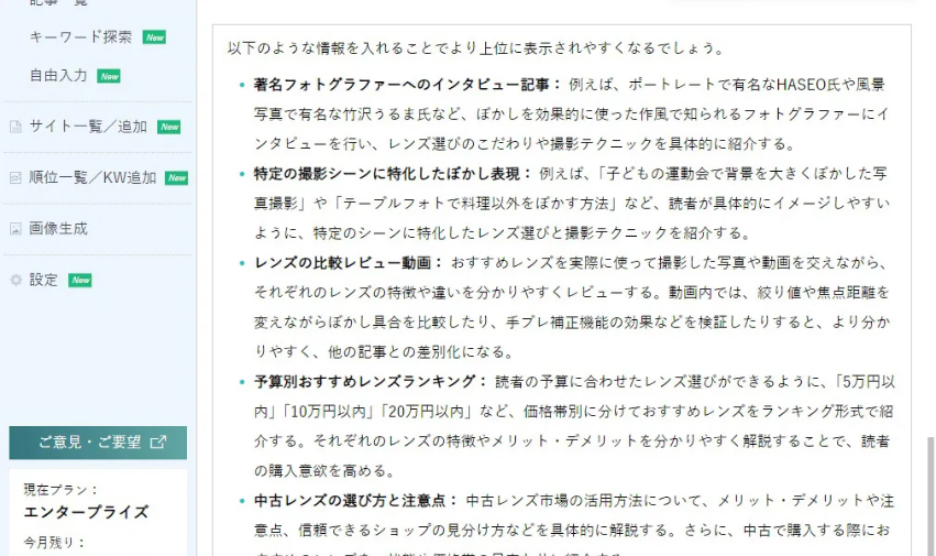 エンタープライズプランは、大規模な企業向けのプランです。高度なSEO対策ツールや専任のサポートスタッフが提供され、カスタマイズ可能なオプションも豊富です。