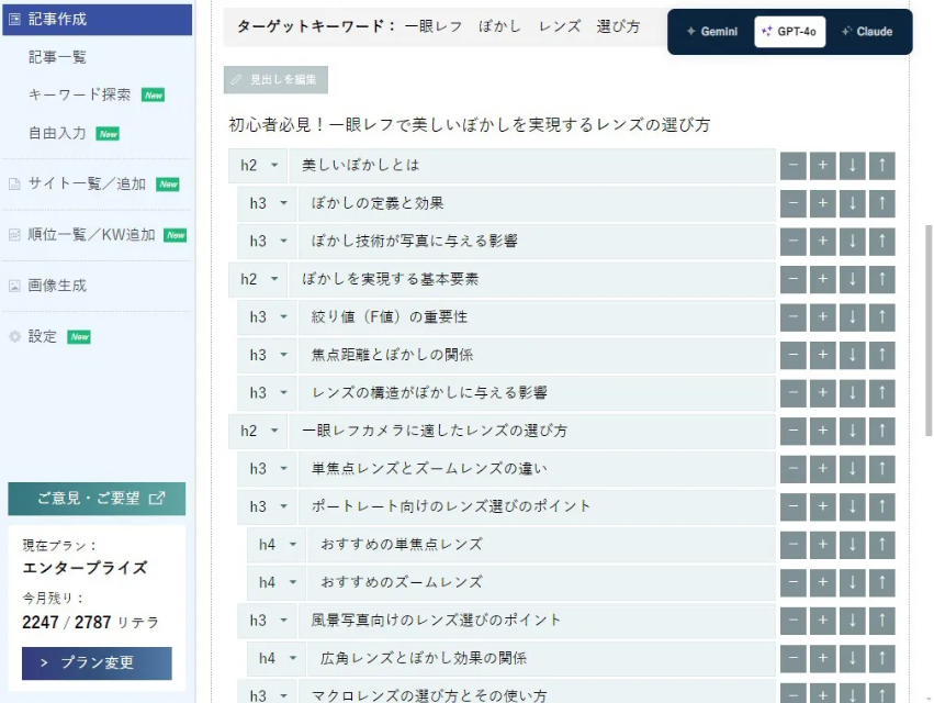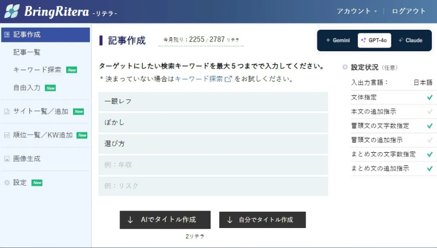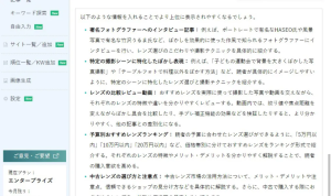 まず、無料版の「Bring Retera」でどんなことができるのかを見てみましょう。無料版では、基本的なライティング支援機能を提供しています。例えば、文章の校正やキーワードの提案、簡単なSEO分析ができます。また、見出しの提案や文章構成のアドバイスも受けられるので、初心者でも安心して使えるんです。